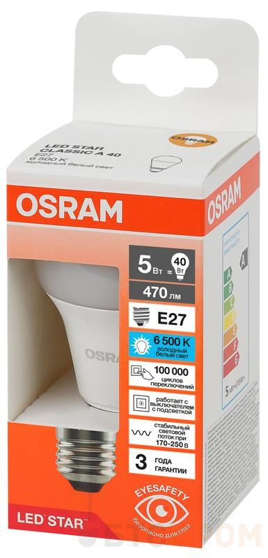 Светодиодные лампы OSRAM - разумная замена традиционным лампам накаливания или галогенным лампам. Светодиодные лампы OSRAM снижают затраты на освещение до 90% при сохранении привычного уровня освещенности. Эта лампа OSRAM серии LED Star выполнена в форме колбы A ("груша") с цоколем E27. Материал колбы - пластик, исполнение - матовое. Световой поток 470 люмен, что соответствует лампе накаливания на 40 Вт. Такие лампы применяются для внутреннего освещения, хотя в закрытом светильнике можно использовать и на улице. Эта лампа излучает холодный белый свет, угол пучка - широкий. Качество света на высоте: низкие пульсации защищают глаза, а высокий индекс цветопередачи позволяет видеть мир в его истинном цвете. Кроме того, лампы OSRAM полностью безопасны для здоровья, поскольку в них нет опасных материалов по европейскому стандарту RoHS, а также они не производят вредных электромагнитных излучений, что подтверждено ЭМС (сертификат электромагнитной совместимости). LED Star - это продвинутая серия OSRAM, среди ее особенностей: 1. Совместимость с выключателем с подсветкой - другие лампы могут вспыхивать или тлеть при работе с выключателем подсветкой, а OSRAM LED Star будет работать как надо. 2. Широкий диапазон входного напряжения - при колебаниях напряжения в сети в пределах 170-250В лампа будет давать стабильный световой поток. Лампа будет работать и при более низком напряжении, но с меньшим количеством света. Лампа проработает долго: срок службы - 40000 часов, 3 года гарантии. Светодиодные лампы OSRAM - умный выбор для здоровья семьи и кошелька!