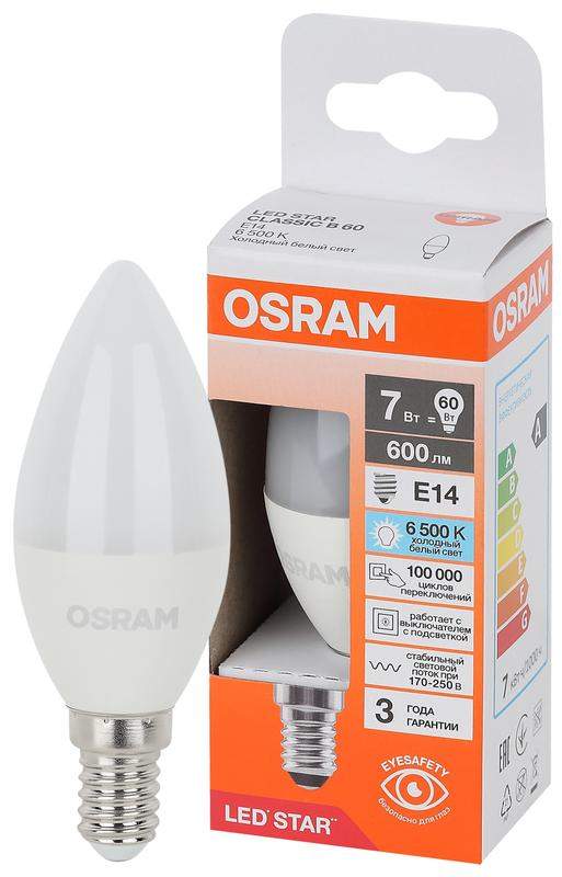 Светодиодные лампы OSRAM - разумная замена традиционным лампам накаливания или галогенным лампам. Светодиодные лампы OSRAM снижают затраты на освещение до 90% при сохранении привычного уровня освещенности. Эта лампа OSRAM серии LED Star выполнена в форме колбы B ("свеча") с цоколем E14. Материал колбы - пластик, исполнение - матовое. Световой поток 600 люмен, что соответствует лампе накаливания на 60 Вт. Такие лампы применяются для внутреннего освещения, хотя в закрытом светильнике можно использовать и на улице. Эта лампа излучает холодный белый свет, угол пучка - широкий. Качество света на высоте: низкие пульсации защищают глаза, а высокий индекс цветопередачи позволяет видеть мир в его истинном цвете. Кроме того, лампы OSRAM полностью безопасны для здоровья, поскольку в них нет опасных материалов по европейскому стандарту RoHS, а также они не производят вредных электромагнитных излучений, что подтверждено ЭМС (сертификат электромагнитной совместимости). LED Star - это продвинутая серия OSRAM, среди ее особенностей: 1. Совместимость с выключателем с подсветкой - другие лампы могут вспыхивать или тлеть при работе с выключателем подсветкой, а OSRAM LED Star будет работать как надо. 2. Широкий диапазон входного напряжения - при колебаниях напряжения в сети в пределах 170-250В лампа будет давать стабильный световой поток. Лампа будет работать и при более низком напряжении, но с меньшим количеством света. Лампа проработает долго: срок службы - 40000 часов, 3 года гарантии. Светодиодные лампы OSRAM - умный выбор для здоровья семьи и кошелька!