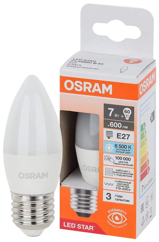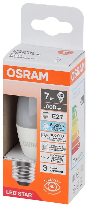 Светодиодные лампы OSRAM - разумная замена традиционным лампам накаливания или галогенным лампам. Светодиодные лампы OSRAM снижают затраты на освещение до 90% при сохранении привычного уровня освещенности. Эта лампа OSRAM серии LED Star выполнена в форме колбы B ("свеча") с цоколем E27. Материал колбы - пластик, исполнение - матовое. Световой поток 600 люмен, что соответствует лампе накаливания на 60 Вт. Такие лампы применяются для внутреннего освещения, хотя в закрытом светильнике можно использовать и на улице. Эта лампа излучает холодный белый свет, угол пучка - широкий. Качество света на высоте: низкие пульсации защищают глаза, а высокий индекс цветопередачи позволяет видеть мир в его истинном цвете. Кроме того, лампы OSRAM полностью безопасны для здоровья, поскольку в них нет опасных материалов по европейскому стандарту RoHS, а также они не производят вредных электромагнитных излучений, что подтверждено ЭМС (сертификат электромагнитной совместимости). LED Star - это продвинутая серия OSRAM, среди ее особенностей: 1. Совместимость с выключателем с подсветкой - другие лампы могут вспыхивать или тлеть при работе с выключателем подсветкой, а OSRAM LED Star будет работать как надо. 2. Широкий диапазон входного напряжения - при колебаниях напряжения в сети в пределах 170-250В лампа будет давать стабильный световой поток. Лампа будет работать и при более низком напряжении, но с меньшим количеством света. Лампа проработает долго: срок службы - 40000 часов, 3 года гарантии. Светодиодные лампы OSRAM - умный выбор для здоровья семьи и кошелька!