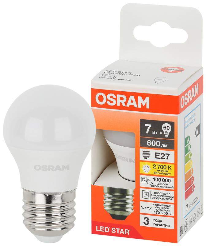 Светодиодные лампы OSRAM - разумная замена традиционным лампам накаливания или галогенным лампам. Светодиодные лампы OSRAM снижают затраты на освещение до 90% при сохранении привычного уровня освещенности. Эта лампа OSRAM серии LED Star выполнена в форме колбы P ("шарик") с цоколем E27. Материал колбы - пластик, исполнение - матовое. Световой поток 600 люмен, что соответствует лампе накаливания на 60 Вт. Такие лампы применяются для внутреннего освещения, хотя в закрытом светильнике можно использовать и на улице. Эта лампа излучает теплый белый свет, угол пучка - широкий. Качество света на высоте: низкие пульсации защищают глаза, а высокий индекс цветопередачи позволяет видеть мир в его истинном цвете. Кроме того, лампы OSRAM полностью безопасны для здоровья, поскольку в них нет опасных материалов по европейскому стандарту RoHS, а также они не производят вредных электромагнитных излучений, что подтверждено ЭМС (сертификат электромагнитной совместимости). LED Star - это продвинутая серия OSRAM, среди ее особенностей: 1. Совместимость с выключателем с подсветкой - другие лампы могут вспыхивать или тлеть при работе с выключателем подсветкой, а OSRAM LED Star будет работать как надо. 2. Широкий диапазон входного напряжения - при колебаниях напряжения в сети в пределах 170-250В лампа будет давать стабильный световой поток. Лампа будет работать и при более низком напряжении, но с меньшим количеством света. Лампа проработает долго: срок службы - 40000 часов, 3 года гарантии. Светодиодные лампы OSRAM - умный выбор для здоровья семьи и кошелька!