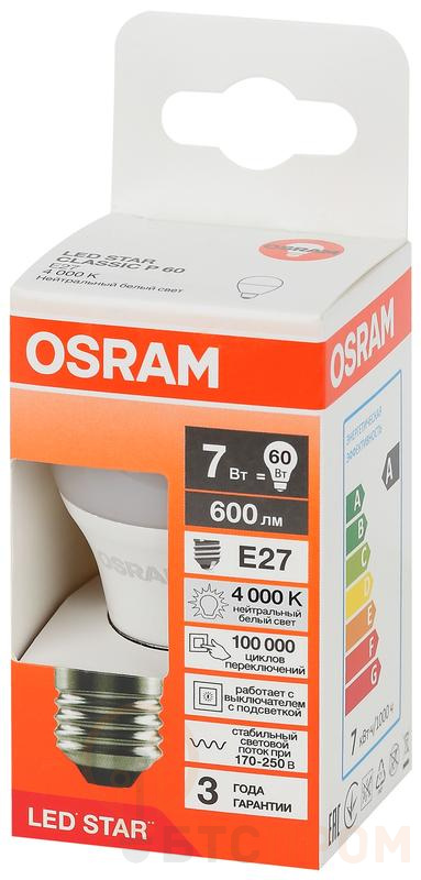 Светодиодные лампы OSRAM - разумная замена традиционным лампам накаливания или галогенным лампам. Светодиодные лампы OSRAM снижают затраты на освещение до 90% при сохранении привычного уровня освещенности. Эта лампа OSRAM серии LED Star выполнена в форме колбы P ("шарик") с цоколем E27. Материал колбы - пластик, исполнение - матовое. Световой поток 600 люмен, что соответствует лампе накаливания на 60 Вт. Такие лампы применяются для внутреннего освещения, хотя в закрытом светильнике можно использовать и на улице. Эта лампа излучает нейтральный белый свет, угол пучка - широкий. Качество света на высоте: низкие пульсации защищают глаза, а высокий индекс цветопередачи позволяет видеть мир в его истинном цвете. Кроме того, лампы OSRAM полностью безопасны для здоровья, поскольку в них нет опасных материалов по европейскому стандарту RoHS, а также они не производят вредных электромагнитных излучений, что подтверждено ЭМС (сертификат электромагнитной совместимости). LED Star - это продвинутая серия OSRAM, среди ее особенностей: 1. Совместимость с выключателем с подсветкой - другие лампы могут вспыхивать или тлеть при работе с выключателем подсветкой, а OSRAM LED Star будет работать как надо. 2. Широкий диапазон входного напряжения - при колебаниях напряжения в сети в пределах 170-250В лампа будет давать стабильный световой поток. Лампа будет работать и при более низком напряжении, но с меньшим количеством света. Лампа проработает долго: срок службы - 40000 часов, 3 года гарантии. Светодиодные лампы OSRAM - умный выбор для здоровья семьи и кошелька!