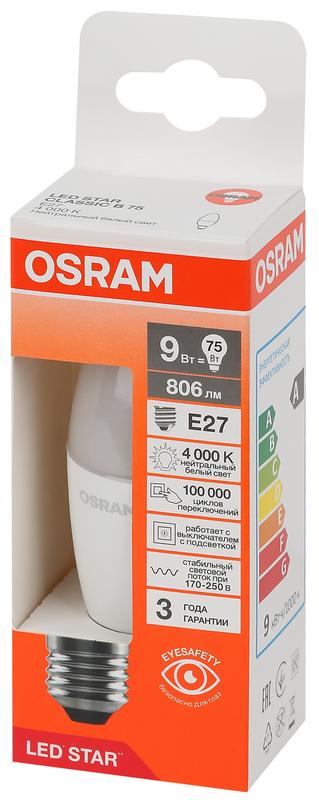 Светодиодная лампа LEDVANCE 4058075697072 серии LED Star. Мощность 9Вт с нейтральным белым светом 4000К. Световой поток 806 лм. Цоколь E27. Форма B. Угол пучка 200 градусов. Диапазон напряжений 170-250В. Матовый пластик. Замена 75Вт ламп. Для офисных помещений и общественных пространств. Равномерное распределение света. Коэффициент пульсаций <10%.