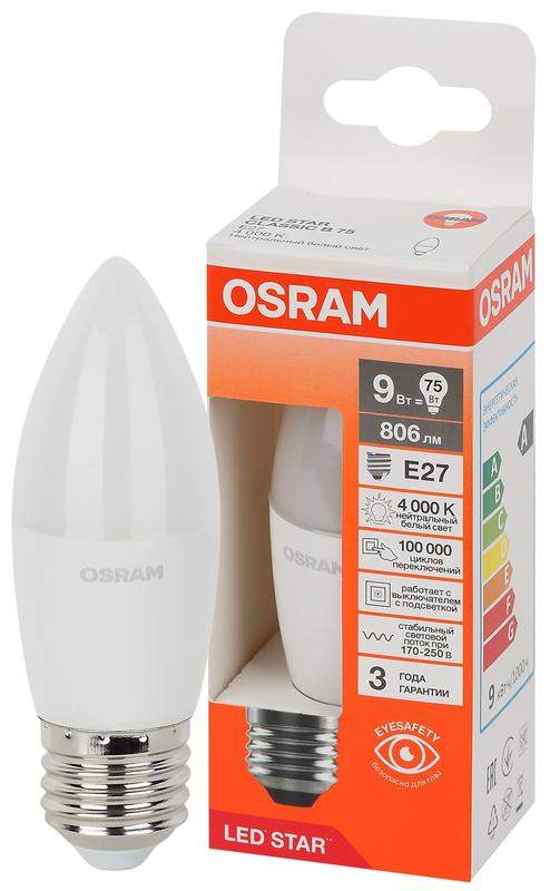 Лампа светодиодная LED Star 9Вт 4000К нейтр. бел. E27 806лм B угол пучка 200град. 170-250В (замена 75Вт) матов. пластик OSRAM 4058075697072