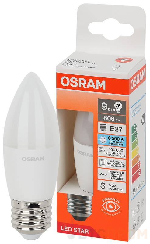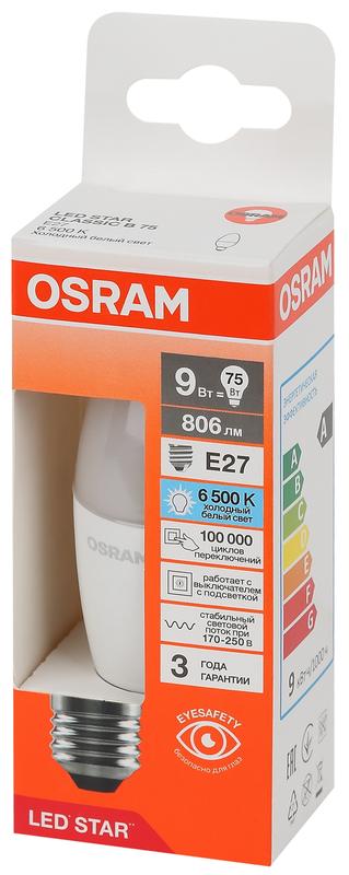 Светодиодная лампа LEDVANCE 4058075697102 серии LED Star. Мощность 9Вт с холодным белым светом 6500К. Световой поток 806 лм. Цоколь E27. Форма B. Угол пучка 200 градусов. Диапазон напряжений 170-250В. Матовый пластик. Замена 75Вт ламп. Для производственных помещений и складов. Высокая контрастность. Защита от влаги и пыли.