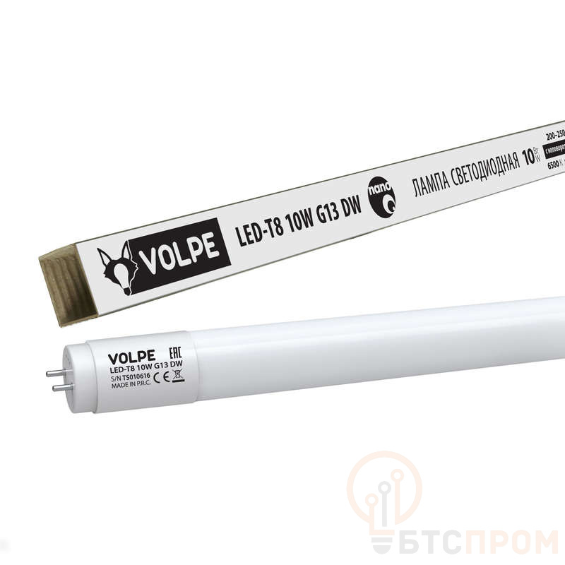 Лампа Volpe LED-T8-10W/DW/G13/FR/FIX/N на 10Вт. Холодный белый свет (6500K), матовая колба, цоколь G13. Неповоротная конструкция. Для линейных светильников.