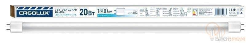 Светодиодная лампа ERGOLUX может быть применена в жилых, офисных и производственных в помещениях, а также в уличных светильниках со степенью защиты не менее IP54. LED лампа, Мощность, Вт - 20, Напряжение, В - 170-265, Световой поток, лм - 1900, Форма колбы - трубка Т8, Цвет колбы - белый, Цоколь G13 не поворотный, Цветовая температура, К - 4500, Угол светового пучка - 300, Индекс цветопередачи 80+, Срок службы, ч. - 30000