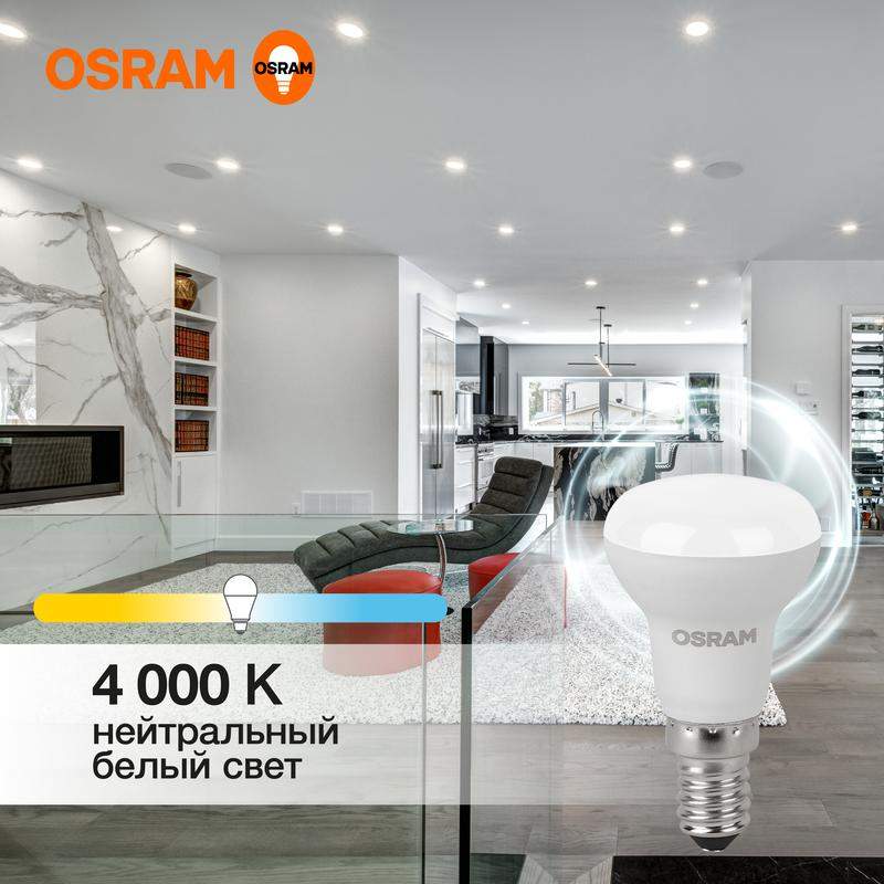 Светодиодные лампы OSRAM - разумная замена традиционным лампам накаливания или галогенным лампам. Светодиодные лампы OSRAM снижают затраты на освещение до 90% при сохранении привычного уровня освещенности. Эта лампа OSRAM серии LED Value выполнена в форме колбы R с цоколем E14. Материал колбы - пластик, исполнение - матовое. Световой поток 400 люмен, что соответствует лампе накаливания на 40 Вт. Это лампа направленного света, что зашифровано в ее названии (R - reflector, рефлектор). Такие лампы давно и успешно применяются для внутреннего освещения с помощью специальных светильников. Эта лампа излучает нейтральный белый свет, угол пучка - узкий. Качество света на высоте: низкие пульсации защищают глаза, а высокий индекс цветопередачи позволяет видеть мир в его истинном цвете. Кроме того, лампы OSRAM полностью безопасны для здоровья, поскольку в них нет опасных материалов по европейскому стандарту RoHS, а также они не производят вредных электромагнитных излучений, что подтверждено ЭМС (сертификат электромагнитной совместимости). Лампа проработает долго: срок службы - 25000 часов, 2 года гарантии. Светодиодные лампы OSRAM - умный выбор для здоровья семьи и кошелька!