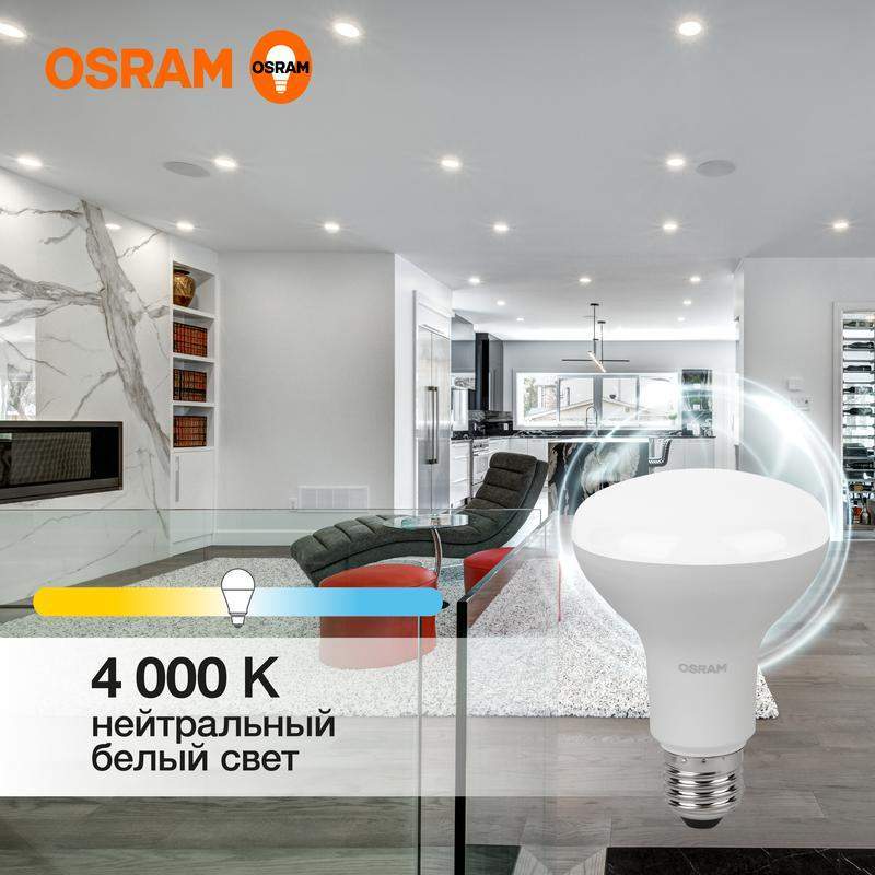 Светодиодные лампы OSRAM - разумная замена традиционным лампам накаливания или галогенным лампам. Светодиодные лампы OSRAM снижают затраты на освещение до 90% при сохранении привычного уровня освещенности. Эта лампа OSRAM серии LED Value выполнена в форме колбы R с цоколем E27. Материал колбы - пластик, исполнение - матовое. Световой поток 880 люмен, что соответствует лампе накаливания на 90 Вт. Это лампа направленного света, что зашифровано в ее названии (R - reflector, рефлектор). Такие лампы давно и успешно применяются для внутреннего освещения с помощью специальных светильников. Эта лампа излучает нейтральный белый свет, угол пучка - узкий. Качество света на высоте: низкие пульсации защищают глаза, а высокий индекс цветопередачи позволяет видеть мир в его истинном цвете. Кроме того, лампы OSRAM полностью безопасны для здоровья, поскольку в них нет опасных материалов по европейскому стандарту RoHS, а также они не производят вредных электромагнитных излучений, что подтверждено ЭМС (сертификат электромагнитной совместимости). Лампа проработает долго: срок службы - 25000 часов, 2 года гарантии. Светодиодные лампы OSRAM - умный выбор для здоровья семьи и кошелька!