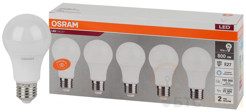 Лампа светодиодная LEDVANCE LED Value LVCLA75 10SW/865 10Вт – лампа формы А с холодным светом. Мощность 10 Вт. Холодный белый свет (6500K) для технических и промышленных зон. Цоколь E27. Матовая колба. Напряжение 230 В. Упаковка по 5 штук. Надежность и энергосбережение OSRAM.
