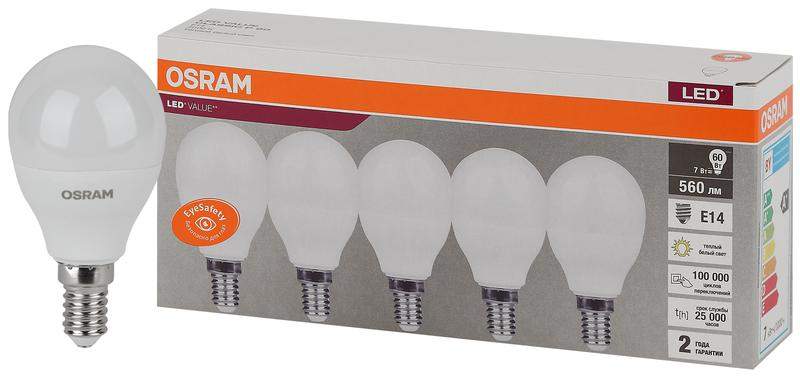 Лампа светодиодная LEDVANCE LED Value LVCLP60 7SW/830 7Вт – лампа-шар (G45) для создания мягкого рассеянного света. Мощность 7 Вт. Теплый белый свет (3000K) создает уютную атмосферу. Цоколь E14. Матовая колба. Напряжение 230 В. Упаковка по 5 штук. Идеальна для закрытых плафонов.