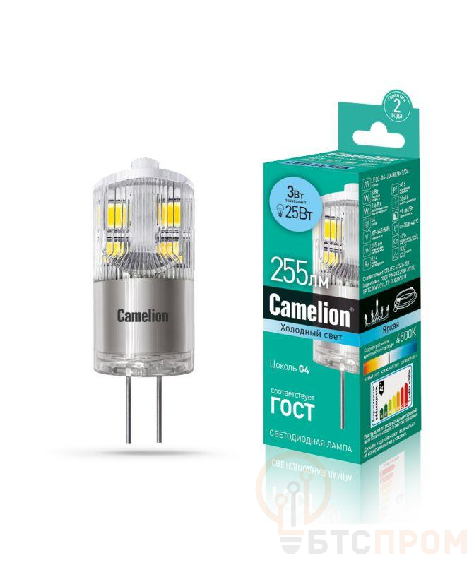 СДЛ Camelion - это инновационное решение, разработанное на основе новейших светодиодных технологий (LED). Предназначена для освещения жилых, офисных и коммерческих помещений. Встроенный источник питания позволяет использовать СДЛ Camelion в стандартных патронах. LED лампа, мощность, Вт - 3, напряжение, В - 207-244, световой поток, лм - 255, форма колбы - капсула, цвет колбы - прозрачный, цоколь G4, цветовая температура, К - 4500, угол светового пучка - 330, индекс цветопередачи 80+, срок службы, ч. - 30000. Без пульсации. Рифленый рассеиватель обеспечивает мягкое рассеяное свечение "без точек"