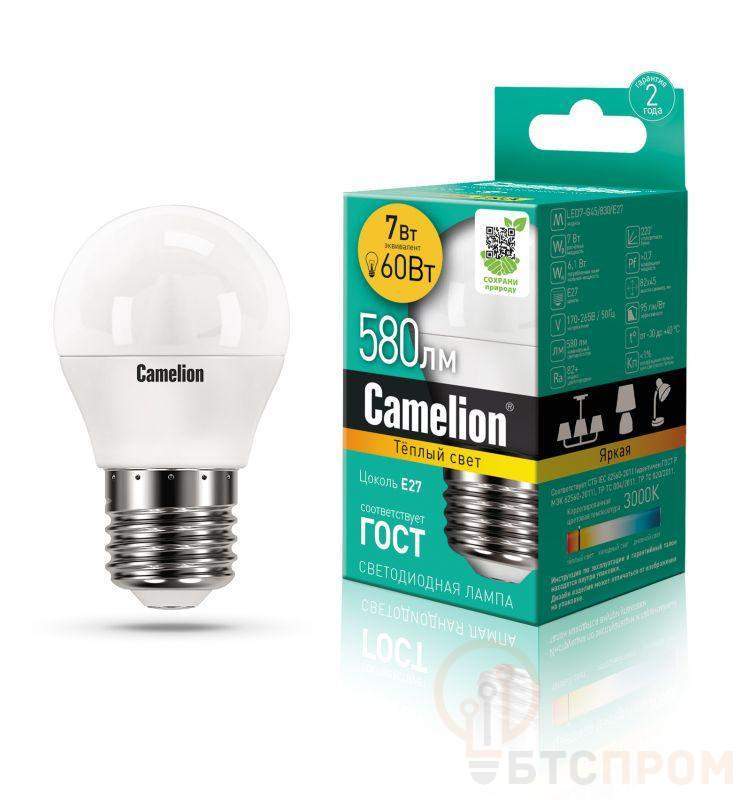Лампа светодиодная LED7-G45/830/E27 7Вт 220В Camelion 12070 – лампа с колбой "шар", теплого белого света, длиной 80 мм, диаметром 45 мм, с цоколем Е27, мощностью 7 Вт. Цветовая температура 3000 К.