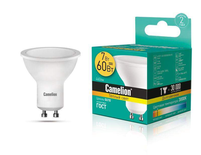 Лампа светодиодная LED7 GU10/830/GU10 7Вт рефлектор матовая 3000К тепл. бел. GU10 490лм 170-265В Camelion 11654