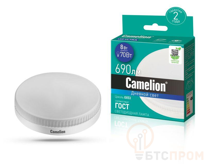 CДЛ Camelion - это инновационное решение, разработанное на основе новейших светодиодных технологий (LED). Предназначена для освещения жилых, офисных и коммерческих помещений. Встроенный источник питания позволяет использовать СДЛ Camelion в стандартных патронах. LED лампа, мощность, Вт - 8, напряжение, В - 170-265, световой поток, лм - 690, форма колбы - рефлектор, цвет колбы - белый, цоколь GX53, цветовая температура, К - 6500, угол светового пучка - 120, индекс цветопередачи 80+, срок службы, ч. - 30000