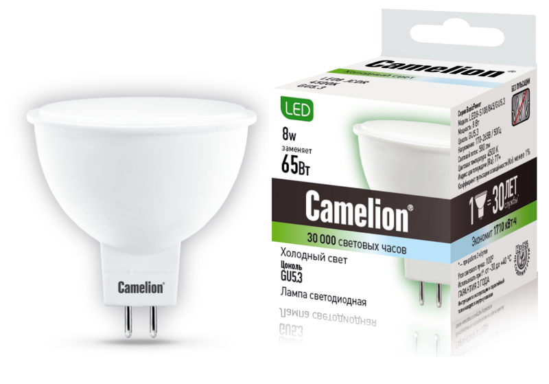 CДЛ Camelion - это инновационное решение, разработанное на основе новейших светодиодных технологий (LED). Предназначена для освещения жилых, офисных и коммерческих помещений. Встроенный источник питания позволяет использовать СДЛ Camelion в стандартных патронах. LED лампа, мощность, Вт - 8, напряжение, В - 170-265, световой поток, лм - 580, форма колбы - рефлектор, цвет колбы - белый, цоколь GU5.3, цветовая температура, К - 4500, угол светового пучка - 100, индекс цветопередачи 80+, срок службы, ч. - 30000