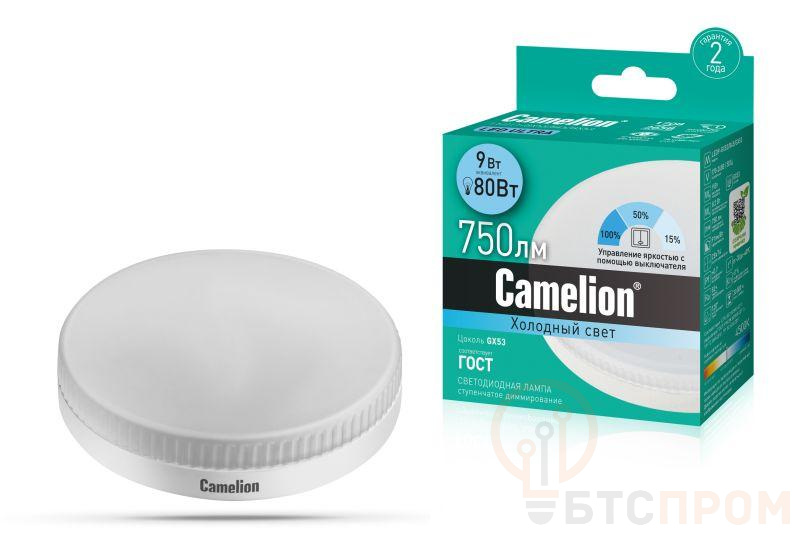 СДЛ Camelion - это инновационное решение, разработанное на основе жилых, новейших светодиодных технологий (LED). Предназначена для освещения офисных и коммерческих помещений. Встроенный источник питания позволяет использовать СДЛ Camelion в стандартных патронах. LED лампа с возможностью диммирования яркости лампы на 100%-50%-15% с помощью выключателя, мощность, Вт - 9, напряжение, В - 170-265, световой поток, лм - 80, цвет колбы - белый, цоколь GX53, цветовая температура, К –4500, угол светового пучка – 120, индекс цветопередачи 80+, срок службы, ч. – 30000