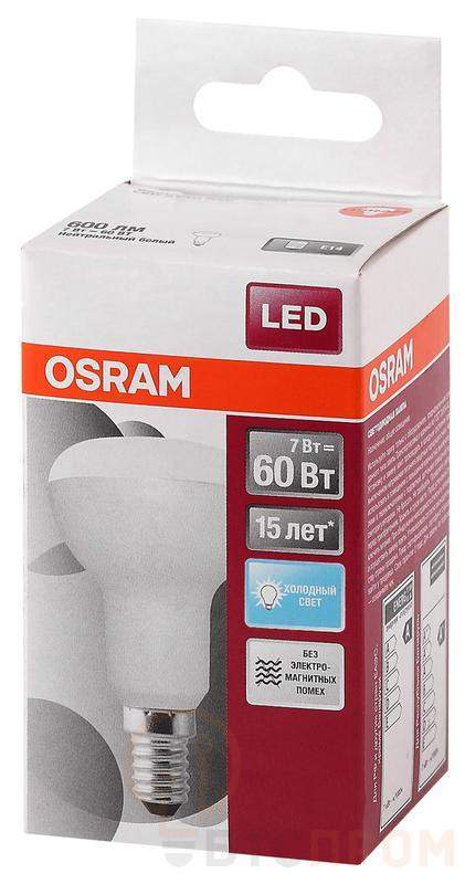 Светодиодные лампы OSRAM - разумная замена традиционным лампам накаливания или галогенным лампам. Светодиодные лампы OSRAM снижают затраты на освещение до 90% при сохранении привычного уровня освещенности. Эта лампа OSRAM серии LED Star выполнена в форме колбы R с цоколем E14. Материал колбы - пластик, исполнение - матовое. Световой поток 600 люмен, что соответствует лампе накаливания на 60 Вт. Это лампа направленного света, что зашифровано в ее названии (R - reflector, рефлектор). Такие лампы давно и успешно применяются для внутреннего освещения с помощью специальных светильников. Эта лампа излучает нейтральный белый свет, угол пучка - узкий. Качество света на высоте: низкие пульсации защищают глаза, а высокий индекс цветопередачи позволяет видеть мир в его истинном цвете. Кроме того, лампы OSRAM полностью безопасны для здоровья, поскольку в них нет опасных материалов по европейскому стандарту RoHS, а также они не производят вредных электромагнитных излучений, что подтверждено ЭМС (сертификат электромагнитной совместимости). Лампа проработает долго: срок службы - 15000 часов, 2 года гарантии. Светодиодные лампы OSRAM - умный выбор для здоровья семьи и кошелька!