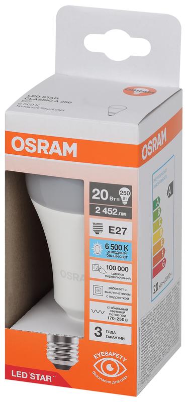 Лампа светодиодная LSCLA250 20W/865 230VFR LED Star 20Вт 6500К холод. бел. E27 2452лм A угол пучка 180град. 170-250В (замена 250Вт) матов. пластик OSRAM 4058075695535