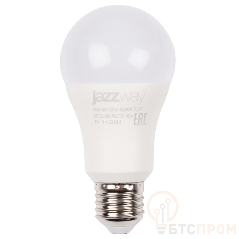 Низковольтная лампа JazzWay PLED-A60 MO на 20 Вт. Нейтральный белый свет 4000К. Цоколь E27. Диапазон 12-48В AC/DC. Высокая мощность и нейтральный свет для основного освещения больших автономных пространств.