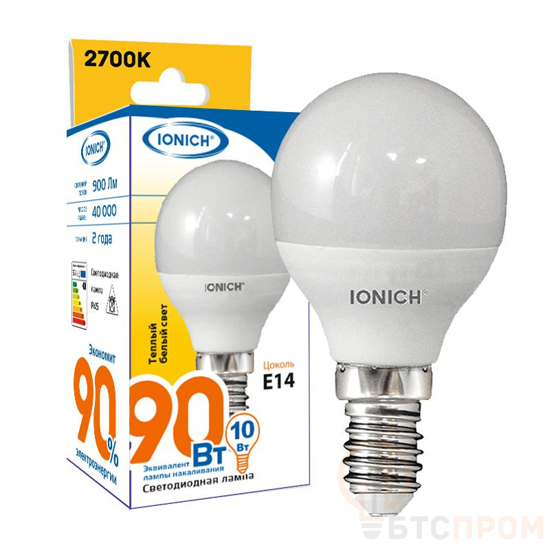 Лампа IONICH P45 на 10Вт. Форма шара, тёплый свет (2700K), цоколь E14. Для декоративных светильников.