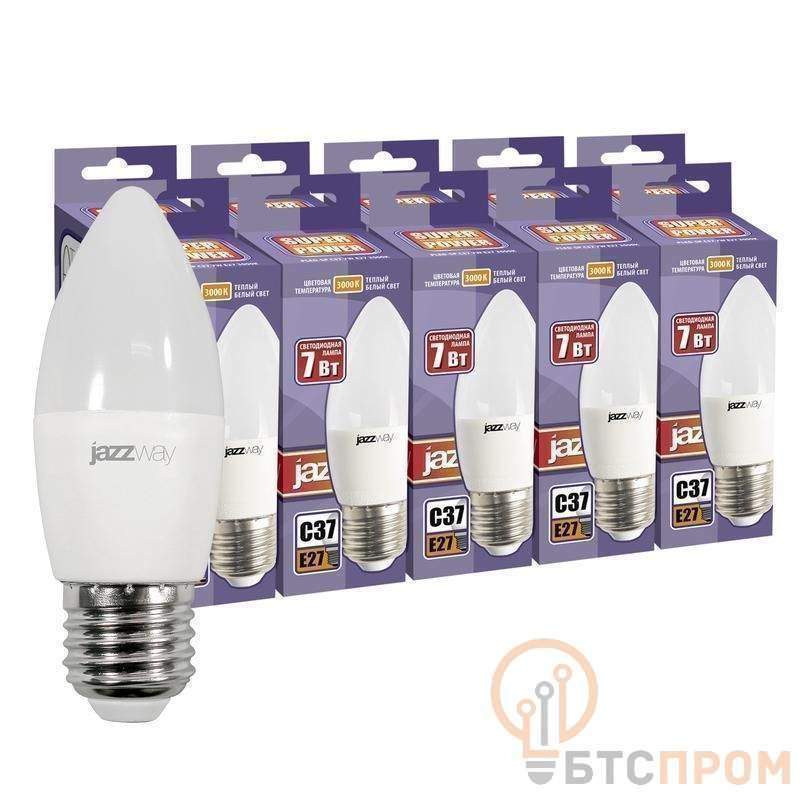 Лампа на 7Вт. Форма C37, тёплый свет (3000K), цоколь E27. Упаковка 10 шт.