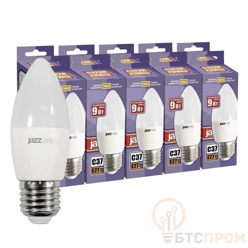 Лампа на 9Вт. Форма C37, тёплый свет (3000K), цоколь E27. Упаковка 10 шт.