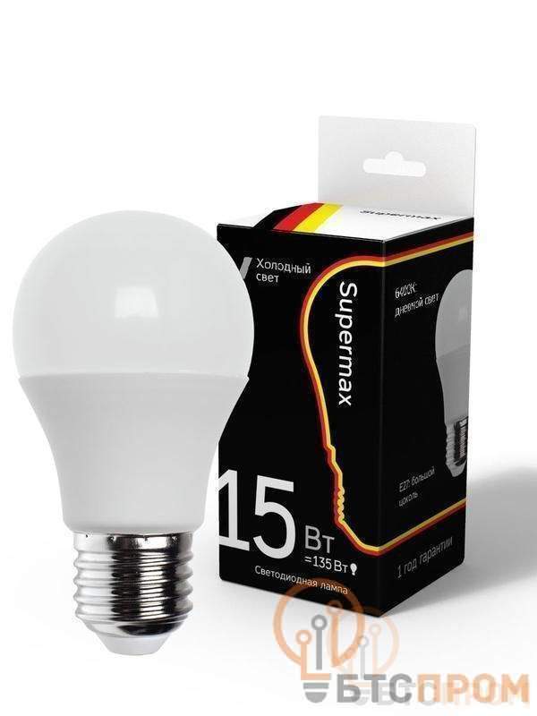 Более мощная лампа формы А60 от КОСМОС Supermax. Мощность 15 Вт и холодный белый свет 6400К обеспечивают очень высокий уровень освещенности, сопоставимый со светом мощной лампы накаливания. Лампа предназначена для освещения просторных помещений с высокими потолками: гостиные, залы, мастерские, торговые площади. Холодный свет бодрит и способствует концентрации. Качественные компоненты обеспечивают стабильную работу даже при длительной эксплуатации.
