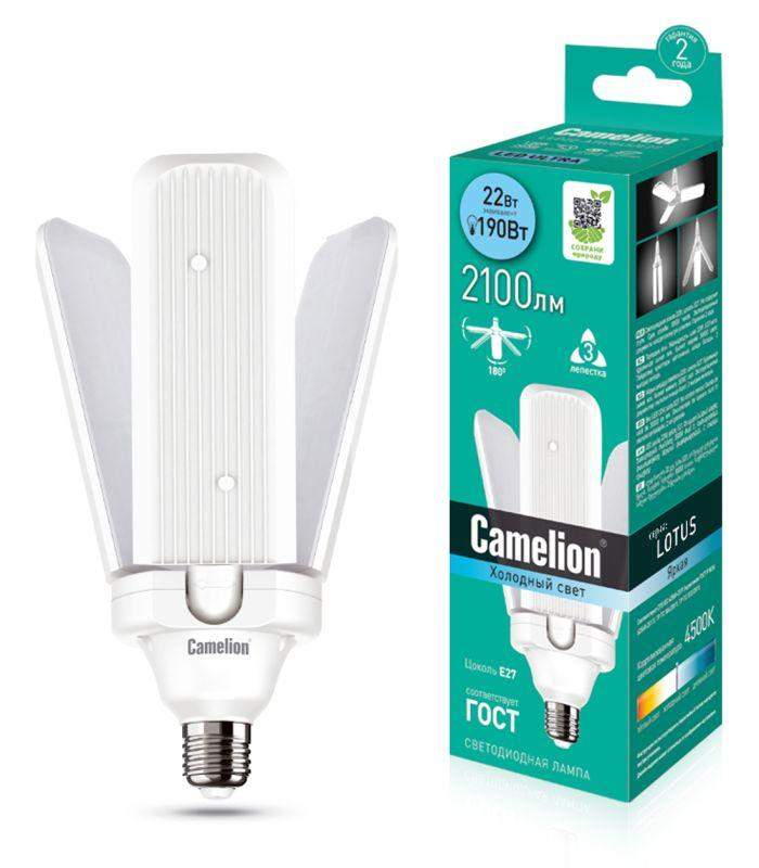 CДЛ Camelion - это инновационное решение, разработанное на основе новейших светодиодных технологий (LED). Предназначена для освещения жилых, офисных и коммерческих помещений. Встроенный источник питания позволяет использовать СДЛ Camelion в стандартных патронах. LED лампа-трансформер, мощность, Вт-22, напряжение, В - 170-265, световой поток, лм - 2100, цвет колбы - белый, цоколь Е27, цветовая температура , К - 4500, угол светового пучка - 360, индекс цветопередачи - 80+, срок службы, ч.-3000, 3 лепестка, поворотная 180 градусов.