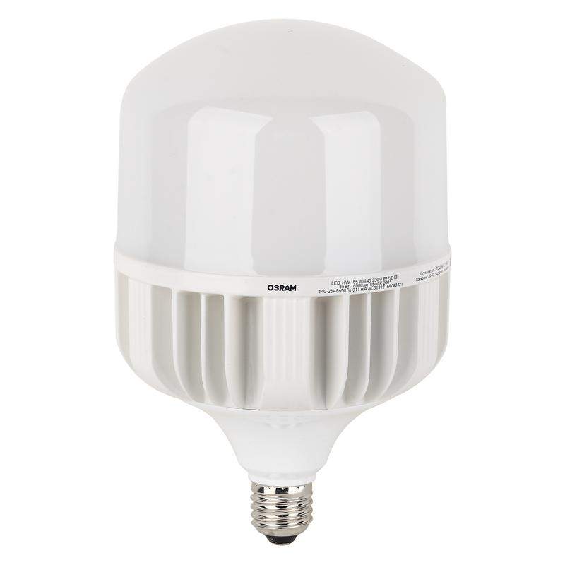 Светодиодные лампы OSRAM - разумная замена традиционным лампам ДРЛ/ДРВ. Светодиодные лампы OSRAM снижают затраты на освещение до 90% при сохранении привычного уровня освещенности. Эта лампа OSRAM серии LED HW выполнена в форме колбы T ("колокол") с цоколем E27/E40. Материал колбы - алюминий, исполнение - матовое. Световой поток 6500 люмен, что соответствует лампе накаливания на 650 Вт. Поскольку лампа выполнена из алюминия, в нее была добавлена двойная изоляция для абсолютной защиты от поражения электрическим током. Обратите внимание на цоколь: лампа снабжена привычным цоколем Е27, однако в комплекте идет переходник на Е40. Такие лампы применяются для внутреннего промышленного освещения (склады, гаражи, цеха и т.д.), хотя в закрытом светильнике можно использовать и на улице. Эта лампа излучает холодный белый свет, угол пучка - широкий. Качество света на высоте: низкие пульсации защищают глаза, а высокий индекс цветопередачи позволяет видеть мир в его истинном цвете. Кроме того, лампы OSRAM полностью безопасны для здоровья, поскольку в них нет опасных материалов по европейскому стандарту RoHS, а также они не производят вредных электромагнитных излучений, что подтверждено ЭМС (сертификат электромагнитной совместимости). Кроме того, эта серия имеет высокий коэффициент мощности (PF), больший 0,9. Это дополнительно снижает затраты на освещение для компаний; кроме того, это снижает нагрузку на проводку и помогает защитить ветхую проводку от пожара. Однако главная особенность OSRAM LED HW - широкий диапазон входного напряжения. При напряжении в сети 140-265В лампа дает стабильный качественный световой поток; более того, лампа будет работать и при более низком напряжении, но с меньшим световым потоком. Там, где другая лампа погаснет, OSRAM будет работать. Лампа проработает долго: срок службы - 30000 часов, 2 года гарантии. Светодиодные лампы OSRAM - умный выбор для безопасности и бюджета!