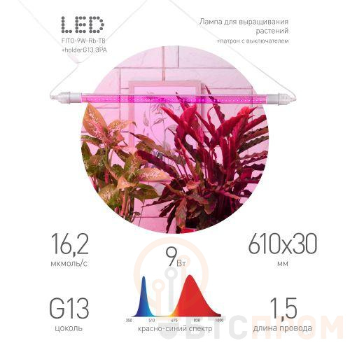 Светильник FITO-9W-Rb-Т8+FITO-Holder IP65 2хG13 линейный для растений с выключателем 1.5м Эра Б0069515