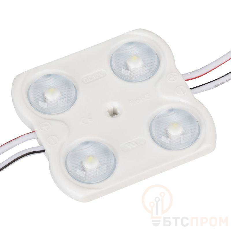 Герметичный светодиодный модуль IP65, ХОЛОДНЫЙ 9000-9500 К, напряжение 12 В, мощность 1.6 Вт, св. поток 160 лм, 4 светодиода SMD 2835, угол 170°. 20 шт на проводе, расстояние между центрами модулей 150 мм, длина провода между модулями 105 мм, рекомендуемая глубина установки 80–180 мм. Размер 45x43x6.2 мм. Гарантия 5 лет. Высокая световая эффективность.