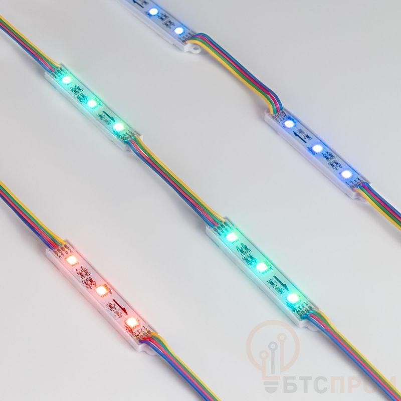 Управляемый светодиодный модуль SPI, RGB, микросхема P9883, напряжение 12 В, мощность 0.6 Вт, 3 светодиода SMD 5060, угол 120°. Создание медиафасадов, 20 шт на проводе, расстояние между модулями 80 мм, 3M скотч. Степень пылевлагозащиты IP66. Размер 90?14?4,5 мм. Гарантия 3 года.