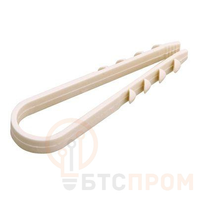 Круглый дюбель-хомут 11-18 мм предназначен для крепления круглого кабеля к поверхности открытым или закрытым способом. Благодаря особой форме может также использоваться для крепления нескольких кабелей. Дюбель-хомут представляет собой крепежное изделие с боковыми шипами и петлей для удержания кабеля. За счет шипов дюбель легко фиксируется в отверстии, но для его извлечения понадобится приложить усилие. Важно: для надежной фиксации дюбеля необходимо соблюдать точные параметры при сверлении отверстия, а для этого желательно использовать новую оснастку, которая не успела износиться. Дюбель может быть установлен в бетон, кирпич, дерево, газобетон и природный камень. Морозостойкие добавки добавляют крепежу устойчивость к низким температурам и позволяют использовать его на улице или в неотапливаемых помещениях. В упаковке 100 дюбель-хомутов белого цвета.