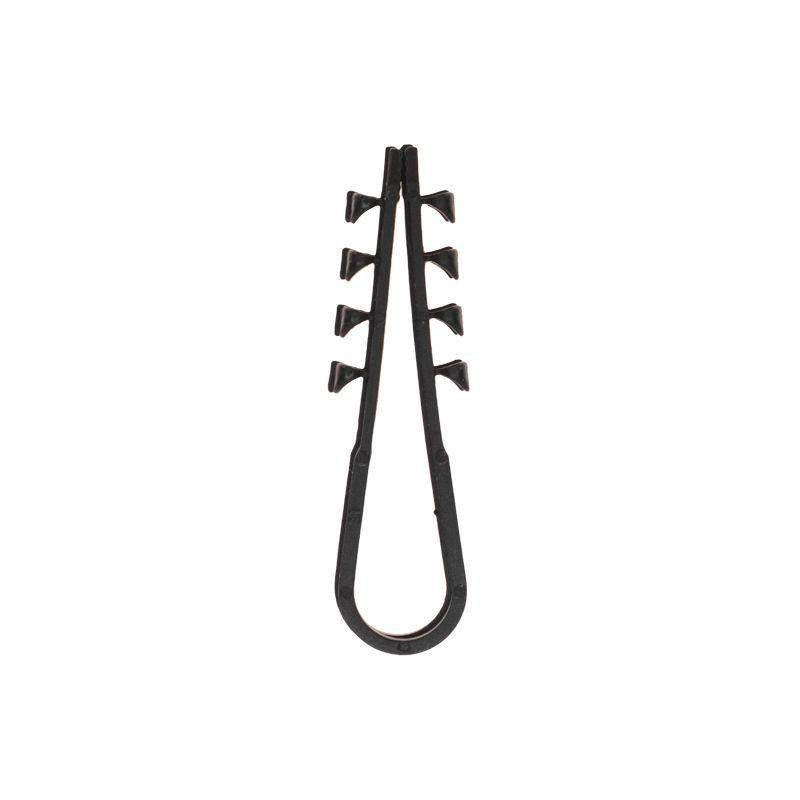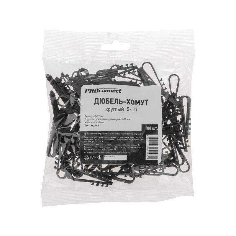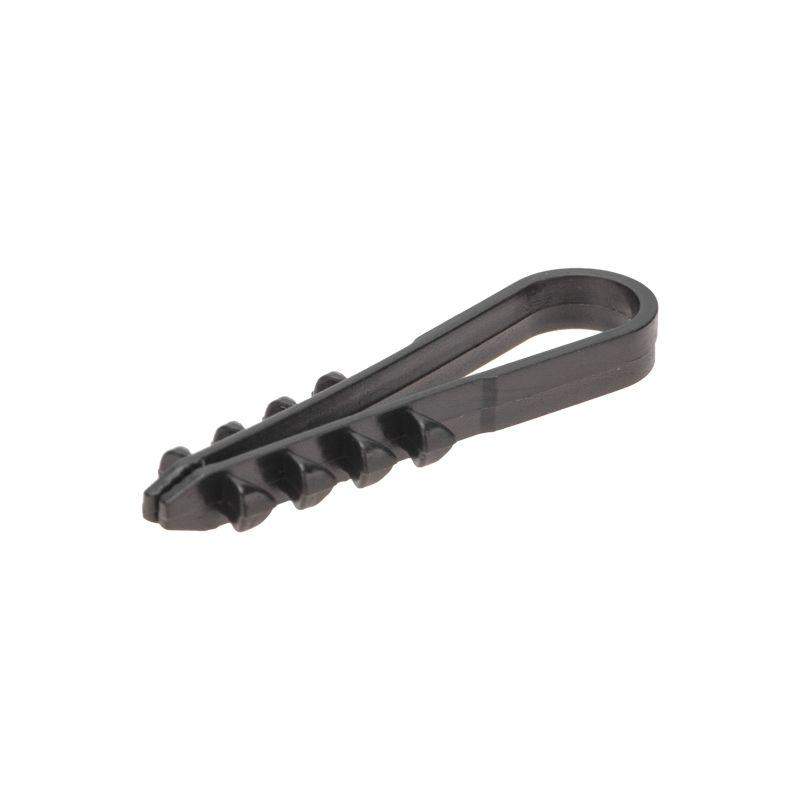 Круглый дюбель-хомут 5-10 мм предназначен для крепления круглого кабеля к поверхности открытым или закрытым способом. Благодаря особой форме может также использоваться для крепления нескольких кабелей. Дюбель-хомут представляет собой крепежное изделие с боковыми шипами и петлей для удержания кабеля. За счет шипов дюбель легко фиксируется в отверстии, но для его извлечения понадобится приложить усилие. Важно: для надежной фиксации дюбеля необходимо соблюдать точные параметры при сверлении отверстия, а для этого желательно использовать новую оснастку, которая не успела износиться. Дюбель может быть установлен в бетон, кирпич, дерево, газобетон и природный камень. Морозостойкие добавки добавляют крепежу устойчивость к низким температурам и позволяют использовать его на улице или в неотапливаемых помещениях. В упаковке 100 дюбель-хомутов черного цвета.