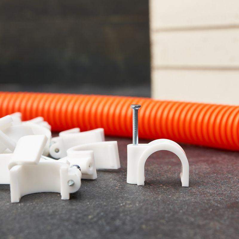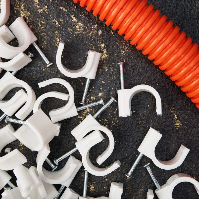 Круглый крепеж 16 мм с гвоздем предназначен для фиксации круглого кабеля к деревянной поверхности. Такой крепеж будет особенно полезен для использования на даче или в частном деревянном доме. Представляет собой дугообразную скобу белого цвета, выполненную из качественного пластика, с гвоздем в специальном отверстии. Скоба используется для мгновенного и надежного крепления проводов и кабелей к поверхностям стен, несущих конструкций и потолков. Гвоздь выполнен из закаленной стали, что позволяет закрепить его даже в плотной и твердой древесине без риска погнуть или сломать.