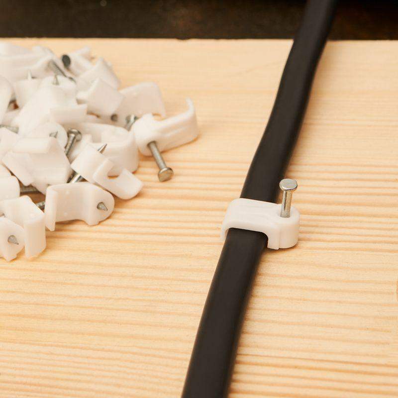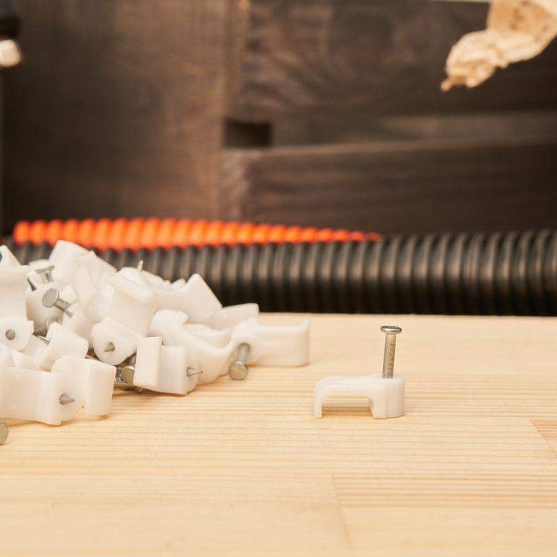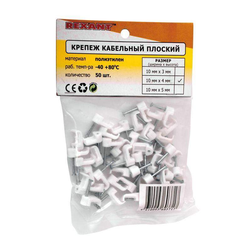 Плоский крепеж 10х4 мм с гвоздем предназначен для фиксации плоского кабеля к деревянной поверхности. Такой крепеж будет особенно полезен для использования на даче или в частном деревянном доме. Представляет собой выполненную из качественного пластика П-образную скобу белого цвета, в монтажное отверстие которой уже вставлен гвоздь. Скоба используется для мгновенного и надежного крепления проводов и кабелей к поверхностям стен, несущих конструкций и потолков. Гвоздь выполнен из закаленной стали, что позволяет закрепить его даже в плотной и твердой древесине без риска погнуть или сломать.