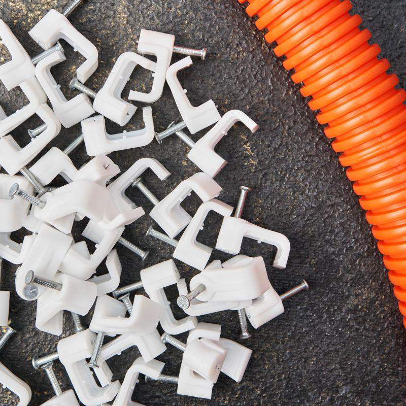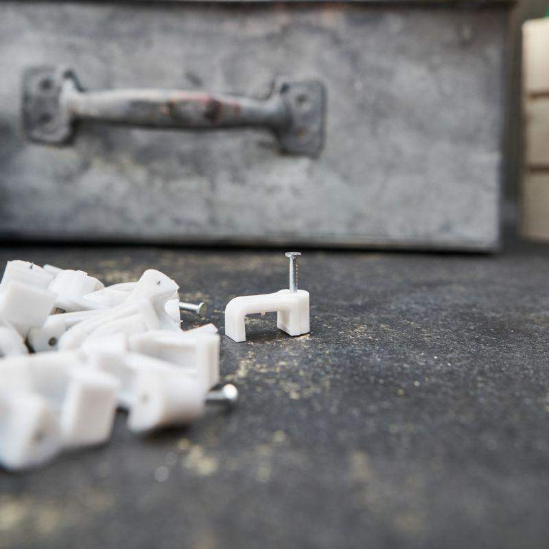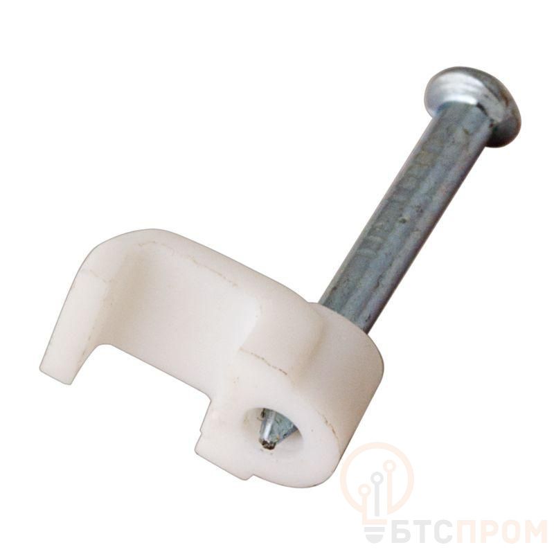 Плоский крепеж 12х6 мм с гвоздем предназначен для фиксации плоского кабеля к деревянной поверхности. Такой крепеж будет особенно полезен для использования на даче или в частном деревянном доме. Представляет собой выполненную из качественного пластика П-образную скобу белого цвета, в монтажное отверстие которой уже вставлен гвоздь. Скоба используется для мгновенного и надежного крепления проводов и кабелей к поверхностям стен, несущих конструкций и потолков. Гвоздь выполнен из закаленной стали, что позволяет закрепить его даже в плотной и твердой древесине без риска погнуть или сломать.