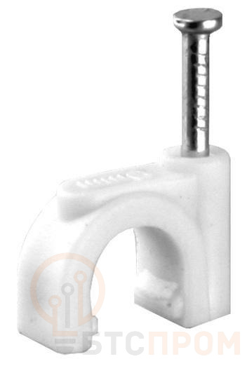 Крепежный материал для фиксации электропроводки, кабеля и т.д. Скоба пластиковая круглая, диаметр провода 5мм, цвет - белый, длина гвоздя - 15мм
