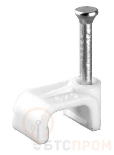 Крепежный материал для фиксации электропроводки, кабеля и т.д. Скоба пластиковая плоская, диаметр провода 8мм, цвет - белый, длина гвоздя - 15мм