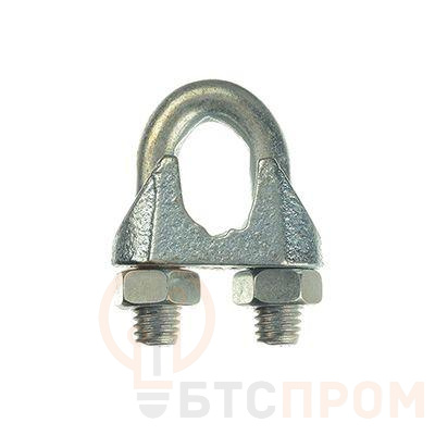 Зажим диаметром 6 мм предназначен для соединения стальных и синтетических тросов, канатов между собой, а также для изготовления петель на краях троса для фиксации и защиты прядей от раскручивания. Размер зажима определяется по диаметру троса. Зажим изготовлен из ковкого чугуна и стали с цинковым покрытием, которое образует защитный барьер на поверхности металла, предотвращающий появление коррозии. Оснащен двумя гайками. Данный зажим используется для статичного крепления грузов и не предназначен для грузоподъемных работ и других динамических нагрузок.