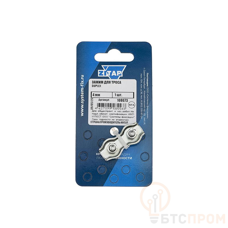 Зажим для троса Duplex диаметром 4 мм от бренда Tech-Krep/Zitar — это надежный и долговечный крепежный элемент, предназначенный для создания прочных и безопасных соединений стальных тросов. Изделие изготовлено из оцинкованной стали, что обеспечивает высокую коррозионную стойкость и позволяет использовать его в условиях повышенной влажности, как на открытом воздухе, так и внутри помещений.