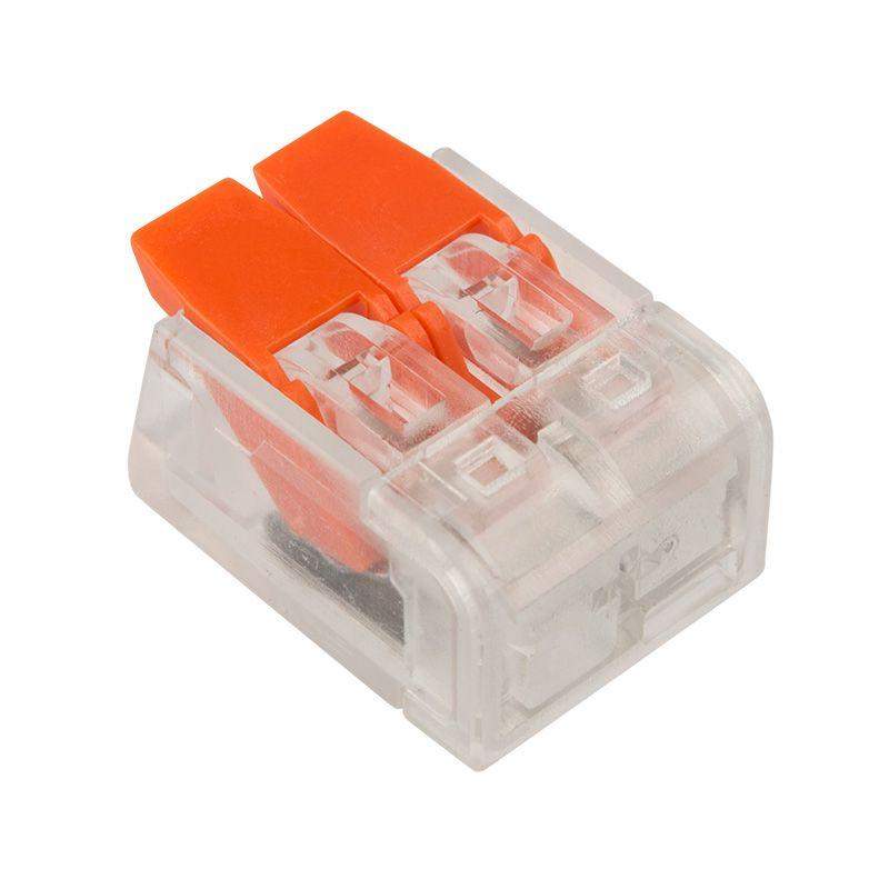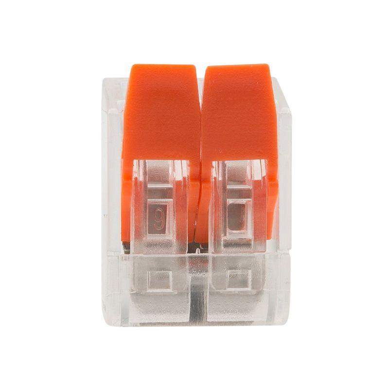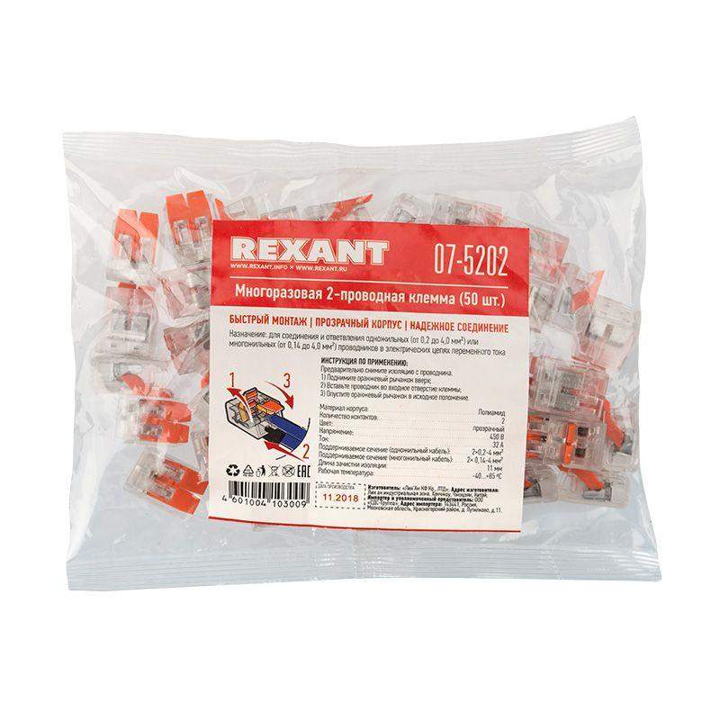 Многоразовая 2-проводная клемма REXANT — это один из самых быстрых, надежных и удобных способов монтажа проводников при небольшой потребности в пространстве в точке коммутации, в условиях нехватки и ограничения пространства. Конструкция на 30 % компактнее привычных рычажковых клемм, прозрачный корпус позволяет контролировать контакт проводников с контактными пластинами, правильность зачистки проводников. Широкие плоские рычаги с меньшим прижимным усилием более удобны и надежны в работе, наличие двух гнезд для тестовых щупов с обеих сторон клеммы облегчает доступ и контроль соединения и питания. Такие клеммы используются для соединения проводников сечением 0,14-4 мм2, а также одножильных и тонкожильных проводников сечением 0,2-4 мм2 (24–12 AWG), они могут передавать ток до 32 А/450 В при максимальной температуре до 85 °C. Характеристики: Размер: 13x9,5x19 мм Материал: Полиамид 66 Количество контактов: 2 Материал контактов: луженая медь Зажим: сталь Цвет: прозрачный Напряжение: 450 В Ток: 32 А Поддерживаемое сечение: 2x0,2-4 мм2 (одножильный провод), 2x 0,14-4 мм2 (многожильный провод) Длина зачистки изоляции: 11 мм Рабочая температура: –40...+85?C