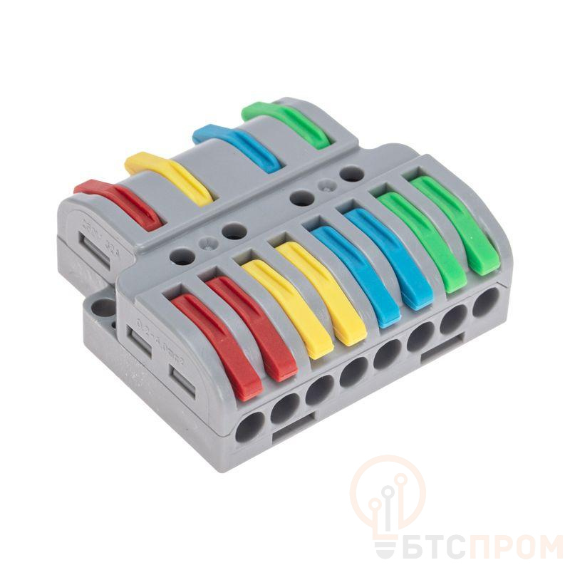 Многоразовые проходные разветвительные клеммы REXANT предназначены для соединения медных одножильных и многожильных зачищенных проводников. Состоит из 4 изолированных полюсов. Применяется для разделения связки из 4 пар проводов на 2 направления. Контакт осуществляется путем зажима проводника пластиной. Конструкция предотвращает случайное размыкание контакта. Специальное технологическое отверстие на корпусе клеммы предназначено для проверки соединения тестером-пробником или щупом мультиметра. Для удобства использования разные фазы клеммы имеют уникальную цветовую разметку. Характеристики: Материал: Полиамид 66 Количество полюсов: 4 Количество вводов: 12 Материал контактов: луженая медь Зажим: сталь Цвет: серый Напряжение: 450 В Типы подключаемых проводов: одножильные, многожильные Ток: для одножильных проводов — 32 А, для многожильных проводов — 24 А Поддерживаемое сечение: 2x0.14-4 мм2 (одножильный провод), 2x0.2-2,5 мм2 (многожильный провод) Рабочая температура: –40...+85 °C Длина зачистки изоляции: 10 мм