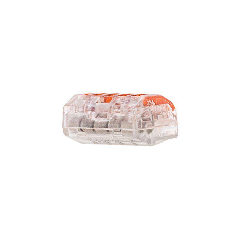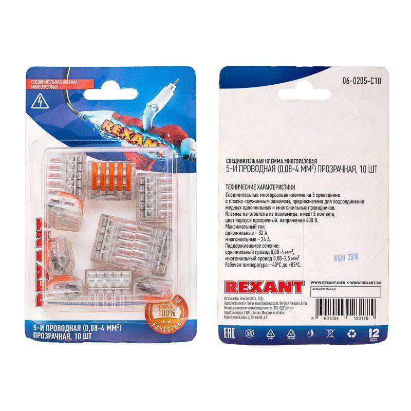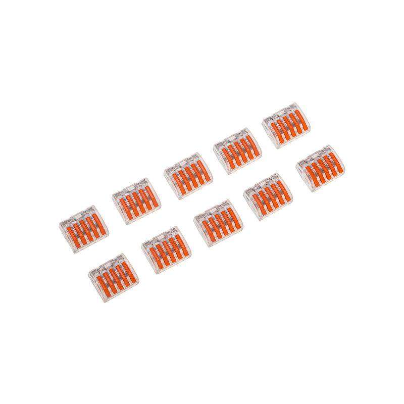 Соединительная многоразовая клемма на 5 проводника с плоско-пружинным зажимом предназначена для подсоединения медных одножильных и многожильных проводников тонкого сечения. Клемма изготовлена из полиамида 66, имеет 5 контакта, цвет корпуса прозрачный, напряжение 400 В. Ток для одножильных проводов - 32А, для многожильных проводов - 24А 28-12 AWG Поддерживаемое сечение: 0.08-4кв.мм (одножильный провод), 0.08-2.5кв.мм (многожильный провод) Рабочая температура: -40?C to +85?C