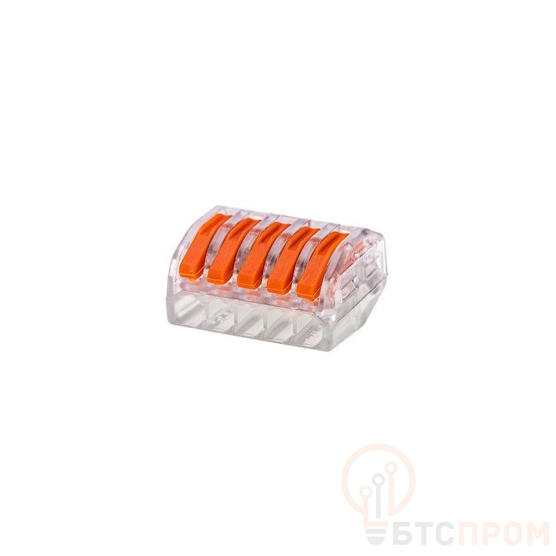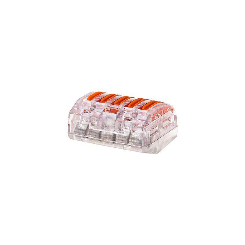 Соединительная многоразовая клемма на 5 проводника с плоско-пружинным зажимом предназначена для подсоединения медных одножильных и многожильных проводников тонкого сечения. Клемма изготовлена из полиамида 66, имеет 5 контакта, цвет корпуса прозрачный, напряжение 400 В. Ток для одножильных проводов - 32А, для многожильных проводов - 24А 28-12 AWG Поддерживаемое сечение: 0.08-4мм2 (одножильный провод), 0.08-2.5мм2 (многожильный провод) Рабочая температура: -40... +85 °C