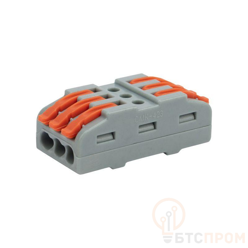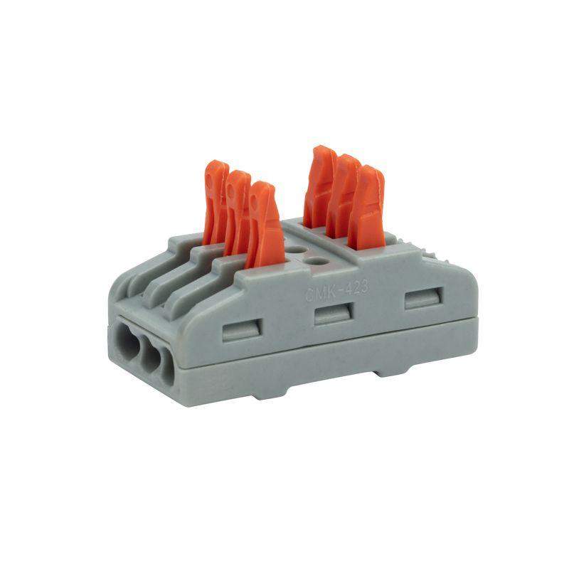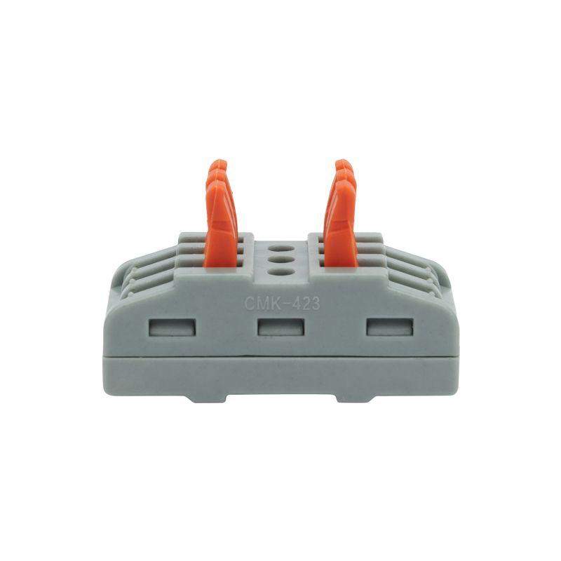 Многоразовые сквозные трехпроводные клеммы REXANT предназначены для соединения медных одножильных и многожильных зачищенных проводников тонкого сечения. Контакт осуществляется путем зажима проводника пластиной. Конструкция предотвращает случайное размыкание контакта. Специальное технологическое отверстие на корпусе клеммы предназначено для проверки соединения тестером-пробником или щупом мультиметра. Корпус из пластика делает контакт изолированным. 1. Сечение многожильного провода - 0,08-4мм2 2. Сечение одножильного жесткого провода - 0,08-2,5мм2 3. Номинальный ток - 32А 4.Номинальное рабочее напряжение - 400В 5.Тип соединения - фиксатор/защелка 6. Количество вводов - 6