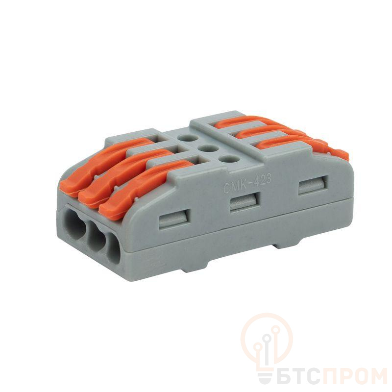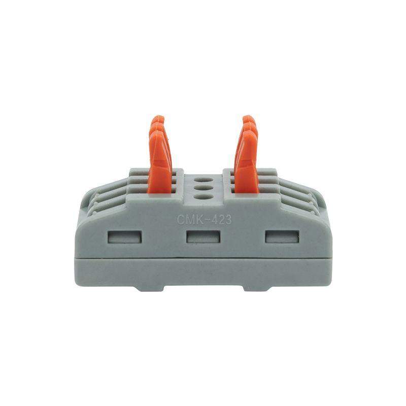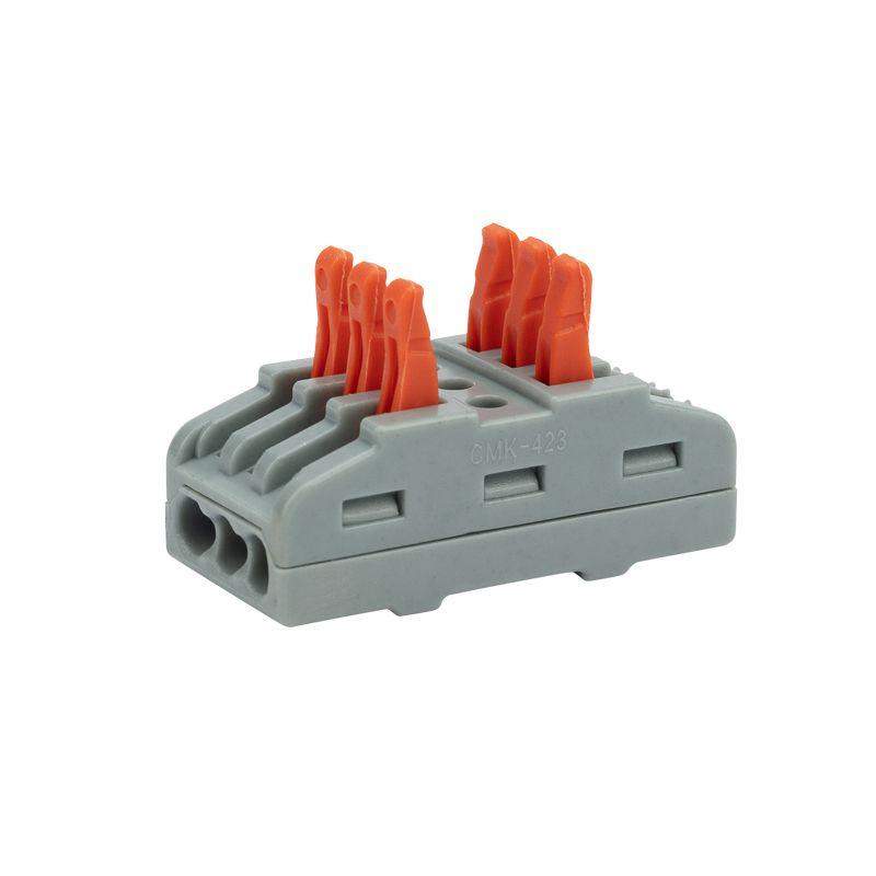 Многоразовые сквозные трехпроводные клеммы REXANT предназначены для соединения медных одножильных и многожильных зачищенных проводников тонкого сечения. Контакт осуществляется путем зажима проводника пластиной. Конструкция предотвращает случайное размыкание контакта. Специальное технологическое отверстие на корпусе клеммы предназначено для проверки соединения тестером-пробником или щупом мультиметра. Корпус из пластика делает контакт изолированным. Технические характеристики: Сечение многожильного провода: 0,08-4 мм2 Сечение одножильного жесткого провода: 0,08-2,5 мм2 Номинальный ток: 32 А Номинальное рабочее напряжение: 400 В Тип соединения: фиксатор/защелка Количество вводов: 6