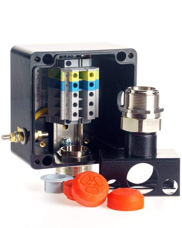 Коробка клеммная взрывозащ. на осн. модульн. упр. устройства MT с метал.опорой для подключ. 1-3 плоск. греющих кабелей или 1-3 сигнал. кабелей d1-3мм 1 резьб. отв. под М25x1.5 клем. колодка 5 модулей 10кв.мм Extherm sborka 1PM/3D