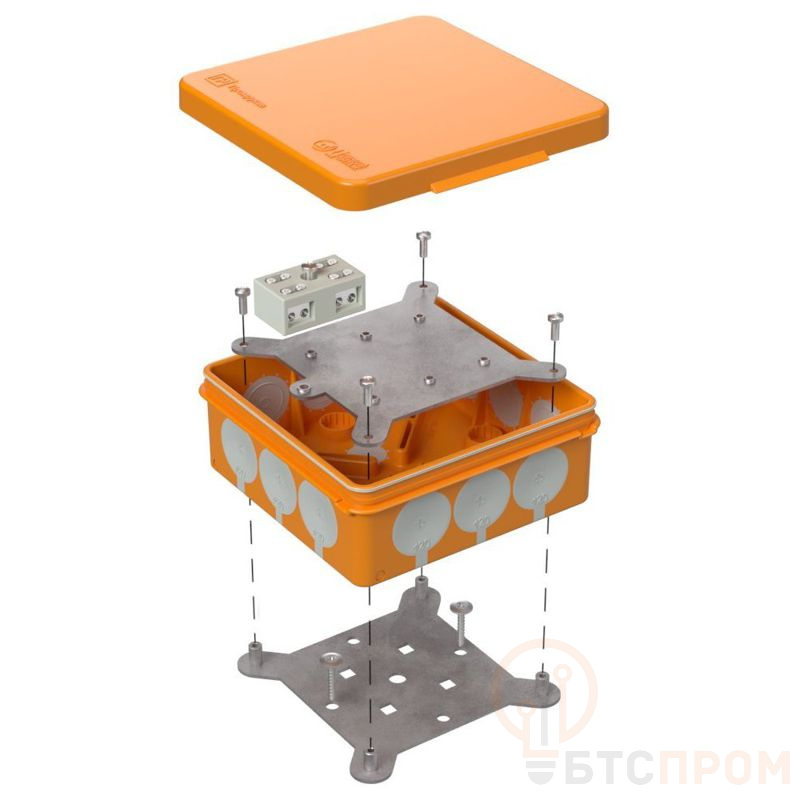 Коробка изготовлена из двух компонентов - основного корпуса и крышки, выполненных из негорючего композитного материала. Размеры 100×100×40 мм оптимальны для размещения стандартных электротехнических устройств. Цветовое исполнение RAL2004 (оранжевый) обеспечивает высокую видимость и соответствие требованиям маркировки.