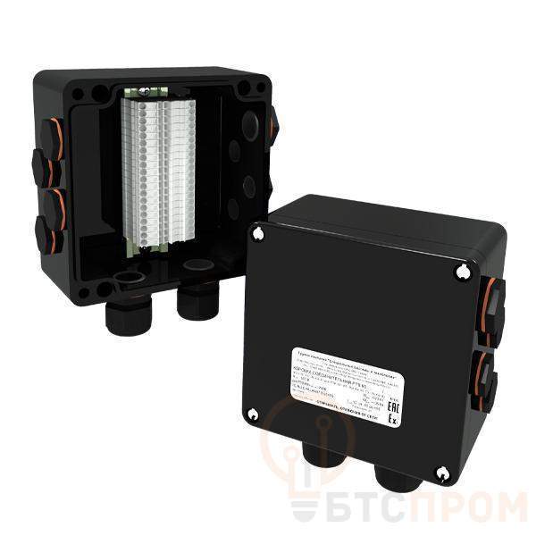 Соединительная коробка РТВ 604 предназначена для подключения кабелей системы управления электрообогревом, а также для подключения до 10 различного рода датчиков и исполнительных устройств к системам управления. Коробка крепится на стене здания, на ближайшей металлоконструкции или при помощи кронштейна непосредственно на трубопроводе. Модель РТВ 604 позволяет выполнить подключение одного или двух кабелей управления и вывода от одного до девяти датчиков температуры. Конструкция корпуса соединительных коробок РТВ 604 обеспечивает защиту от проникновения влаги и пыли степени IP66 и высокую коррозионную стойкость. Кабельные вводы коробки предназначены для подключения небронированных контрольных кабелей диаметром от 7 до 18 мм или бронированных контрольных кабелей диаметром от 12 до 20 мм. Применяемые клеммные наборы позволяют обеспечить подключение многожильных или одножильных проводов сечением от 0,5 до 2,5 кв.мм. Для заказов доступны исполнения коробок с винтовыми или пружинными клеммными соединителями. Подключаемые кабели могут быть дополнительно защищены устройством механической защиты (ввод герметичный гибкий, ВГГ). Особенности Эффективное решение для подключения кабелей управления Имеет сертификат соответствия для применения во взрывоопасных зонах Все необходимые комплектующие входят в состав коробки Широкий спектр решаемых задач Быстрый и простой монтаж Высокая термостойкость ?Не подвергается коррозии